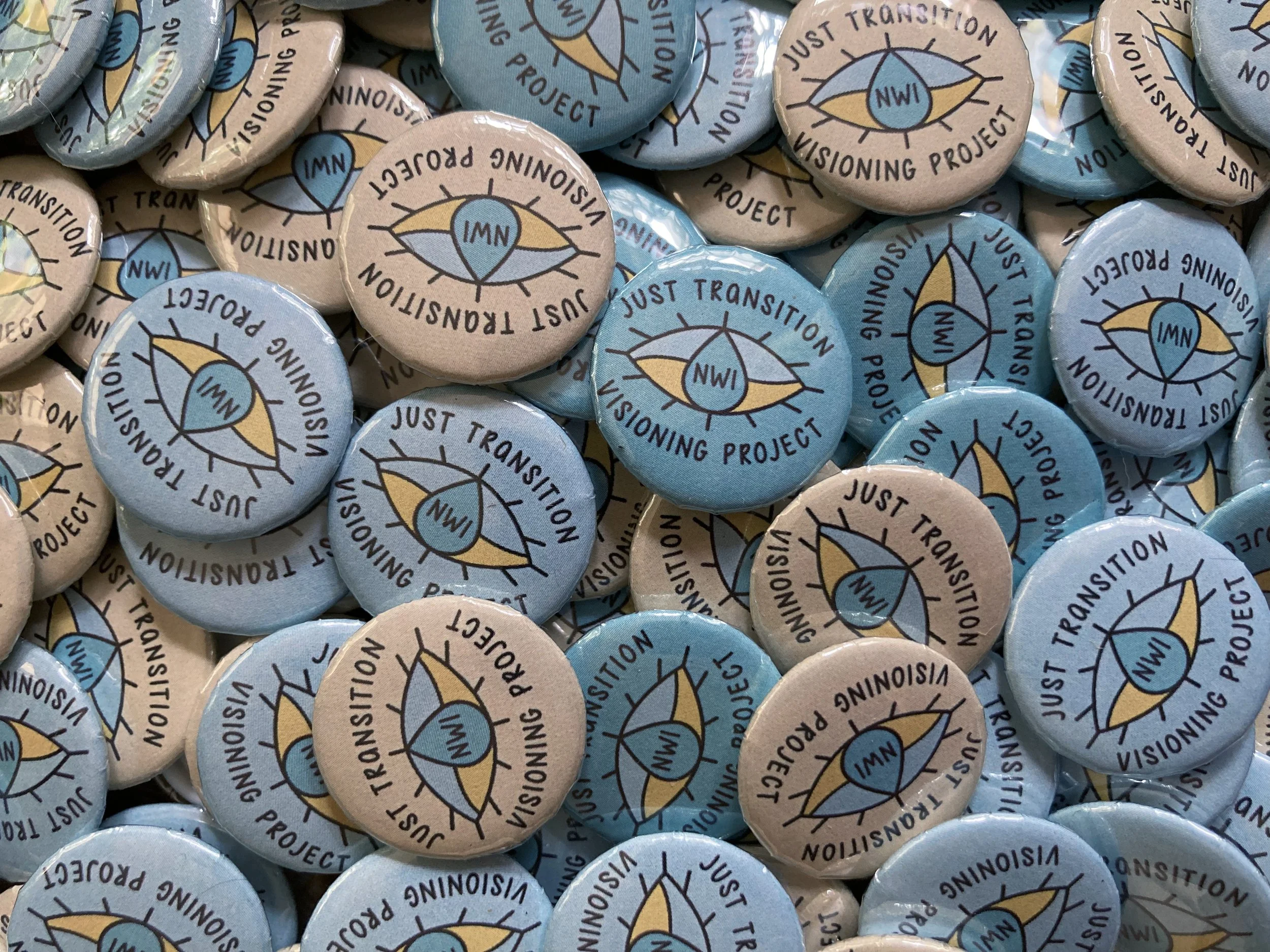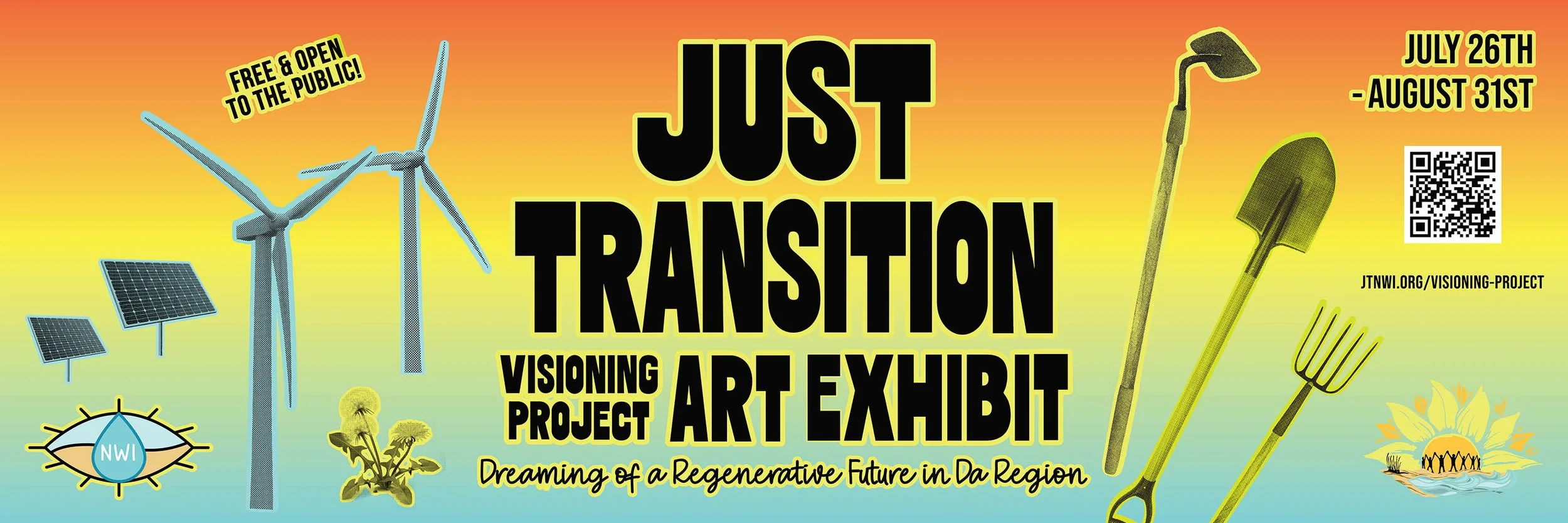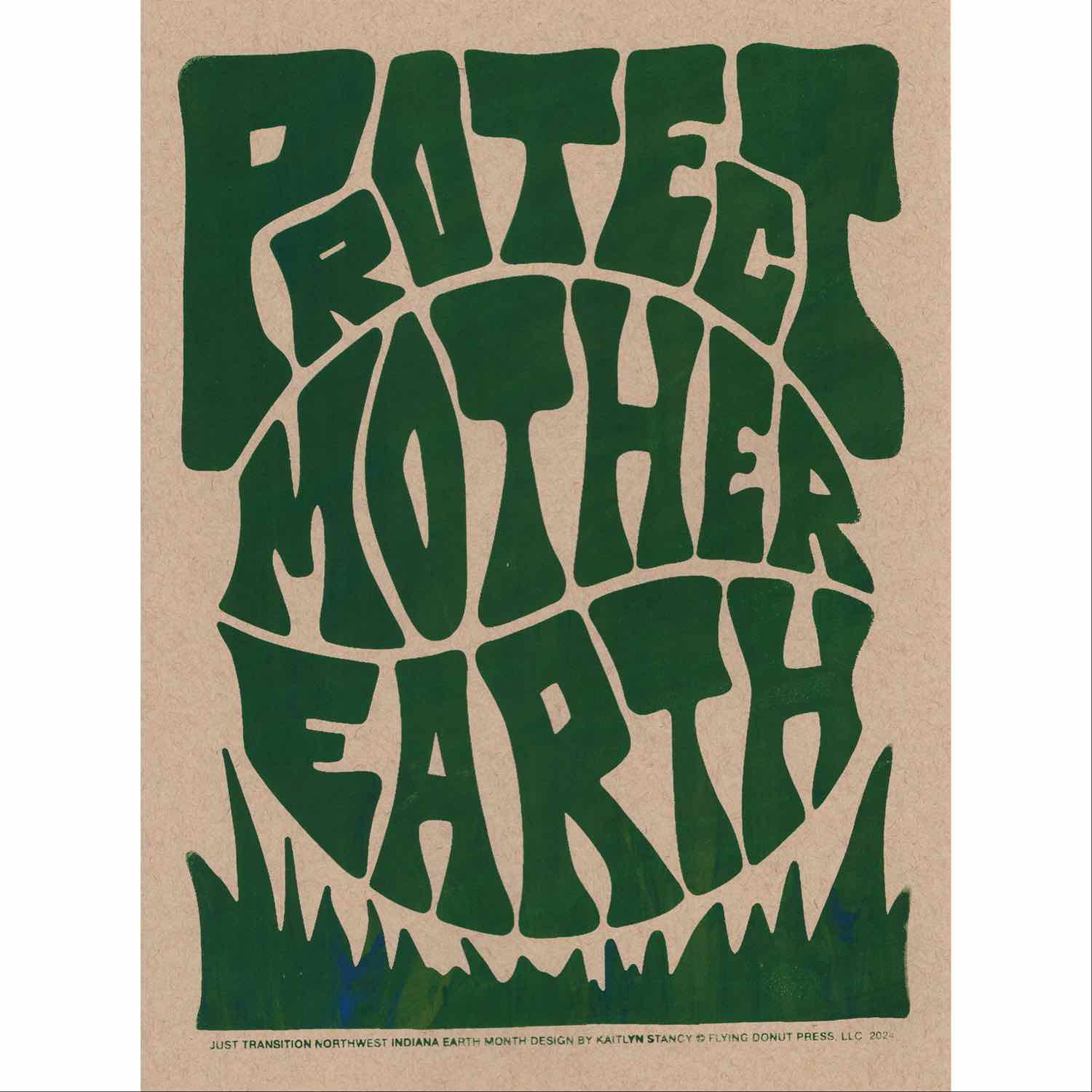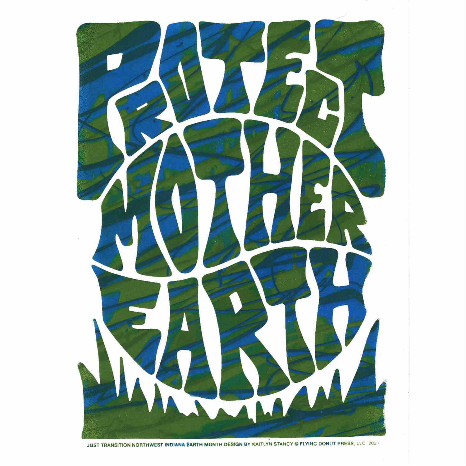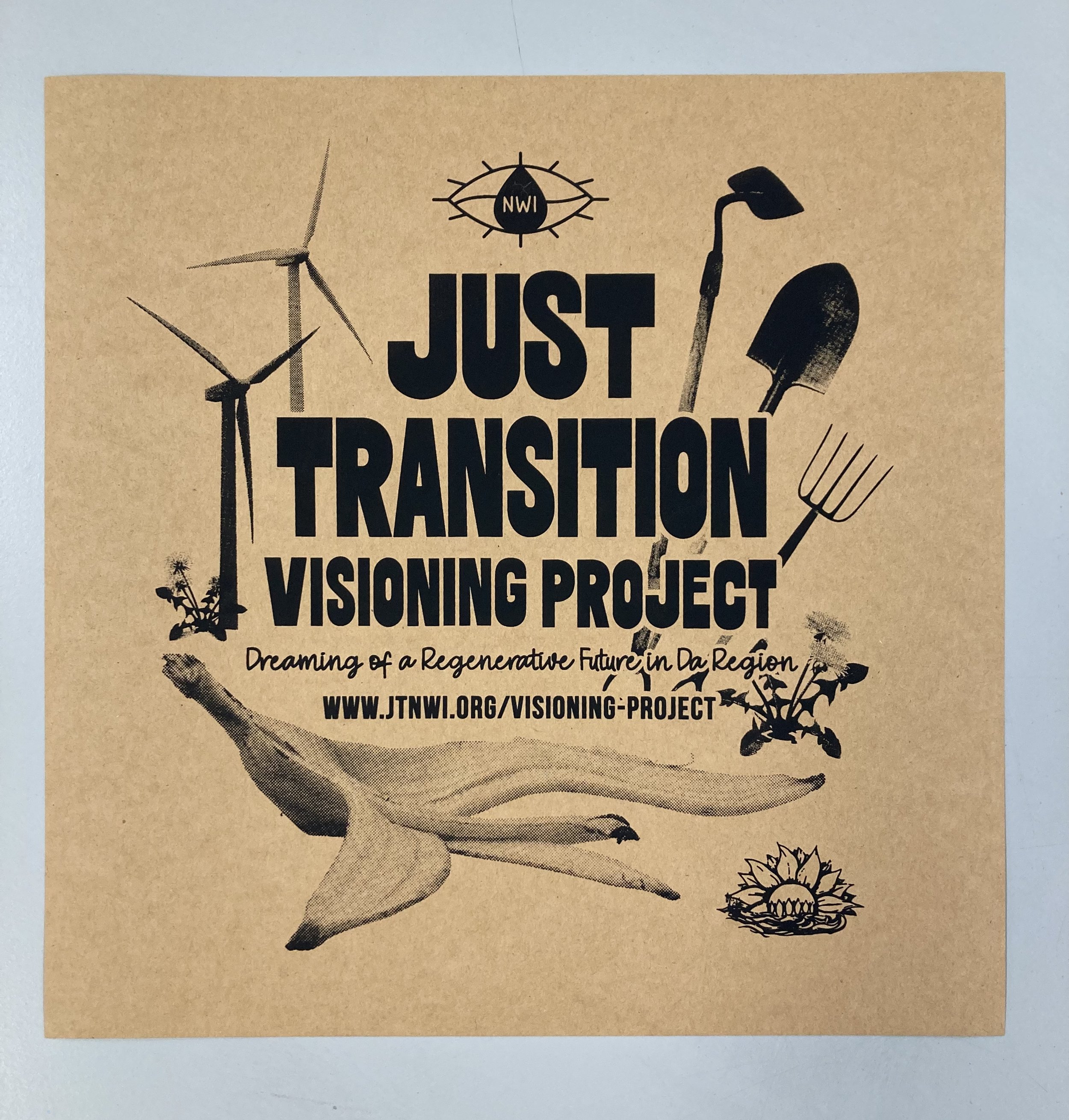 The Just Transition Visioning Project is a new program that was launched in 2024 by Just Transition NWI and partner artists to dream of a “Just Transition” for the region through art workshops and many other visionary activities. Kaitlyn was invited to be a host artist for this project and created the logo, as well as buttons, stickers, coloring sheets, bandanas, tote bags, flyers, banners, art prints, a zine, thank you cards, and swag bags full of goodies for all of the participating artists at the Just Transition Visioning Project Art Exhibit at Paul Henry’s Art Gallery in Hammond, IN on 7/26/24. She also performed onsite screen printing and supplied bandanas and art prints for multiple Earth Day and Pride events throughout the months of May and June 2024.