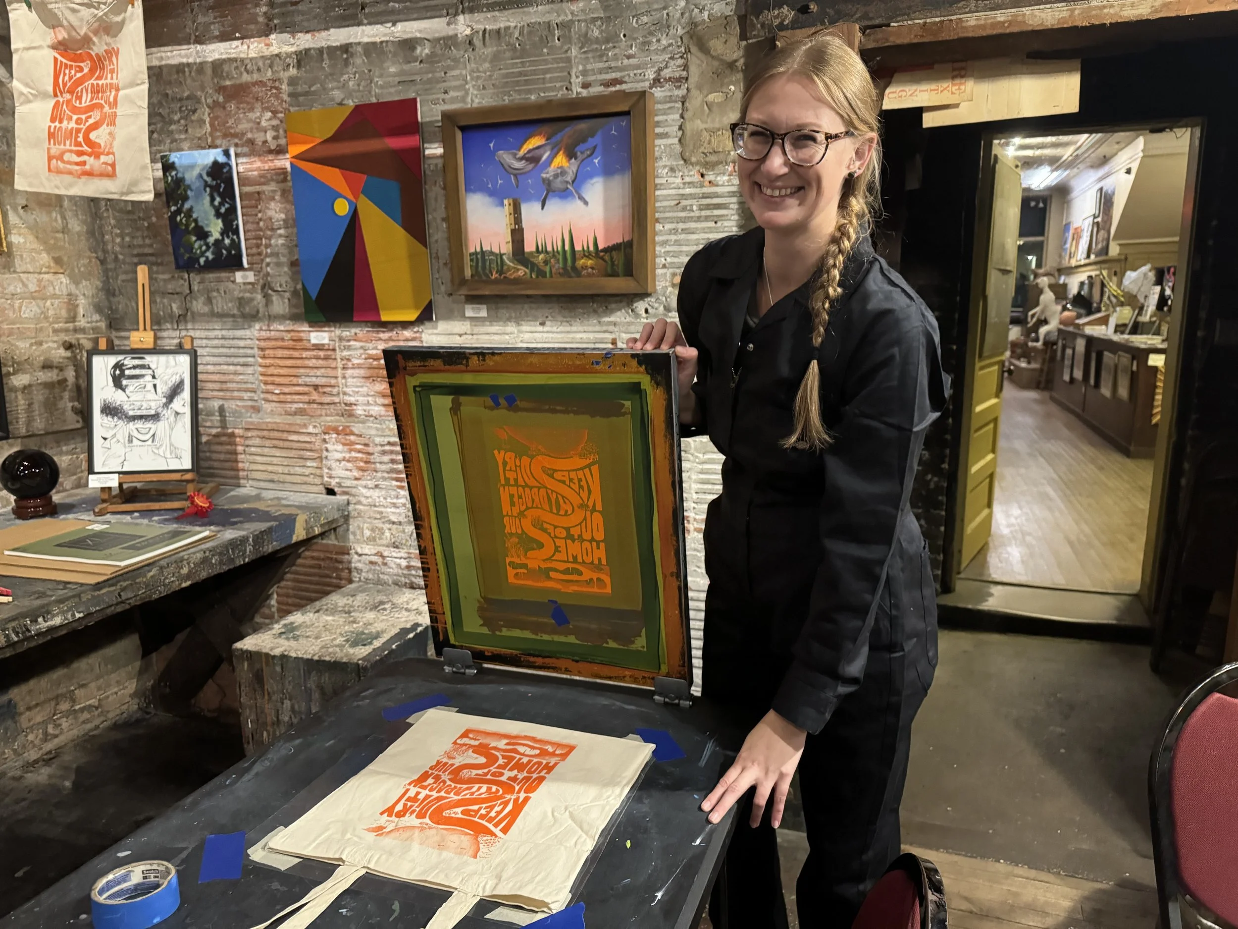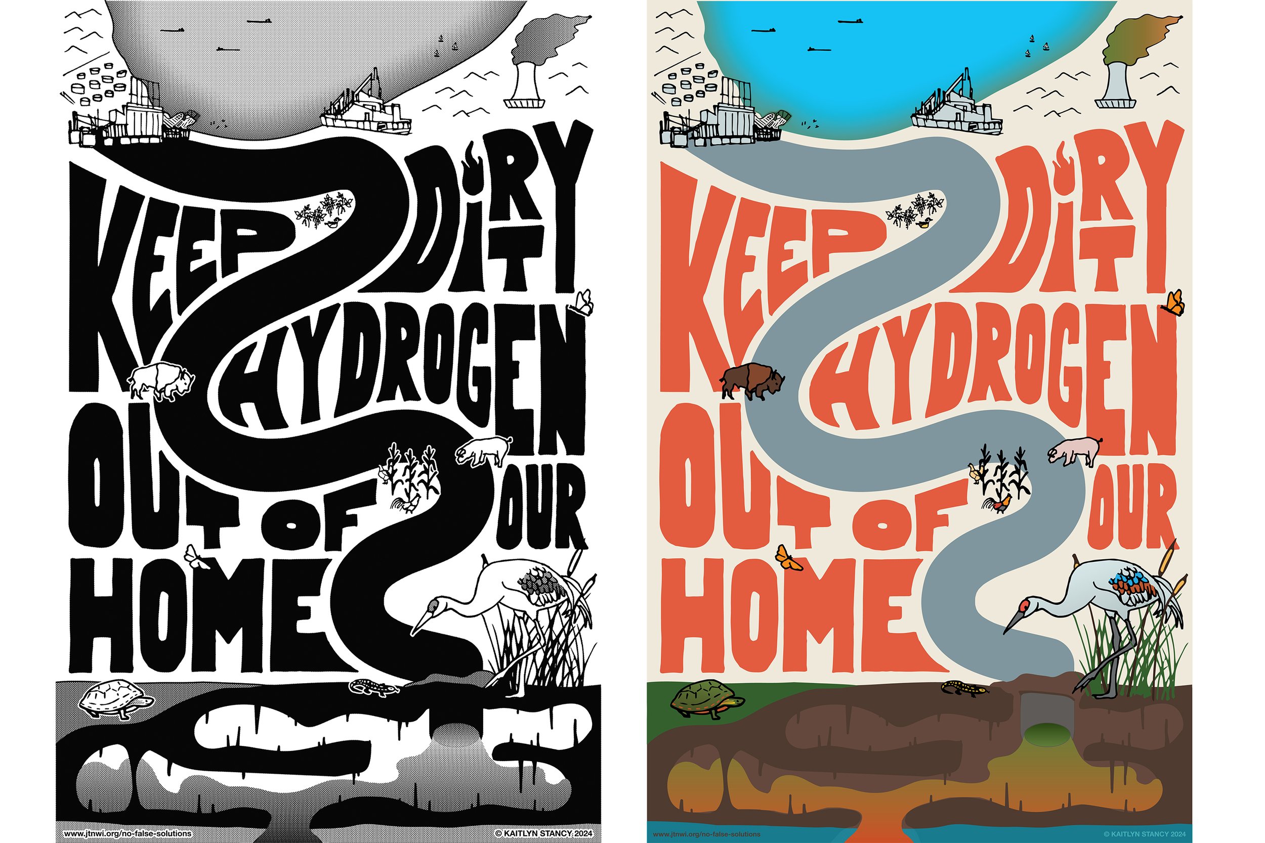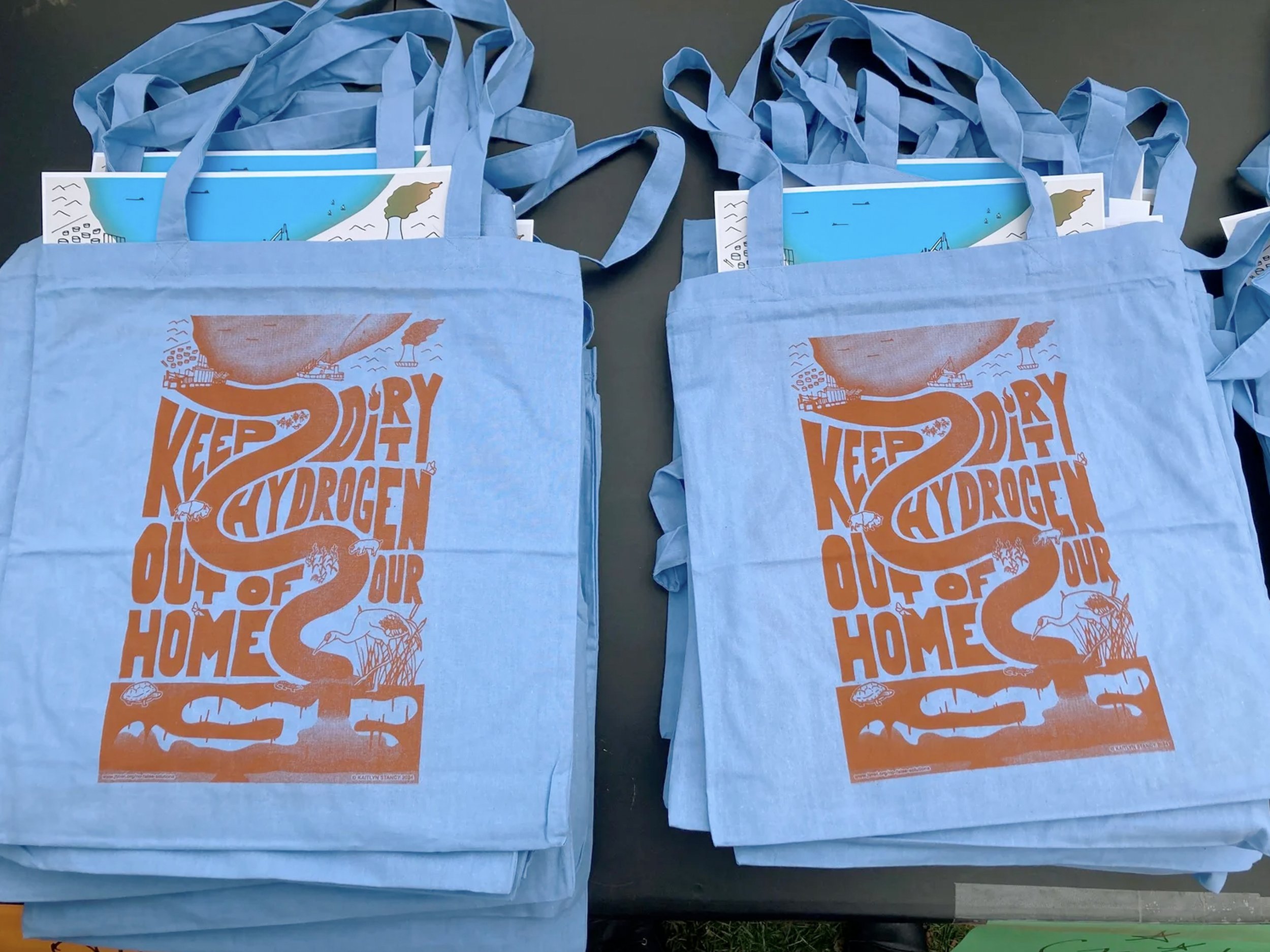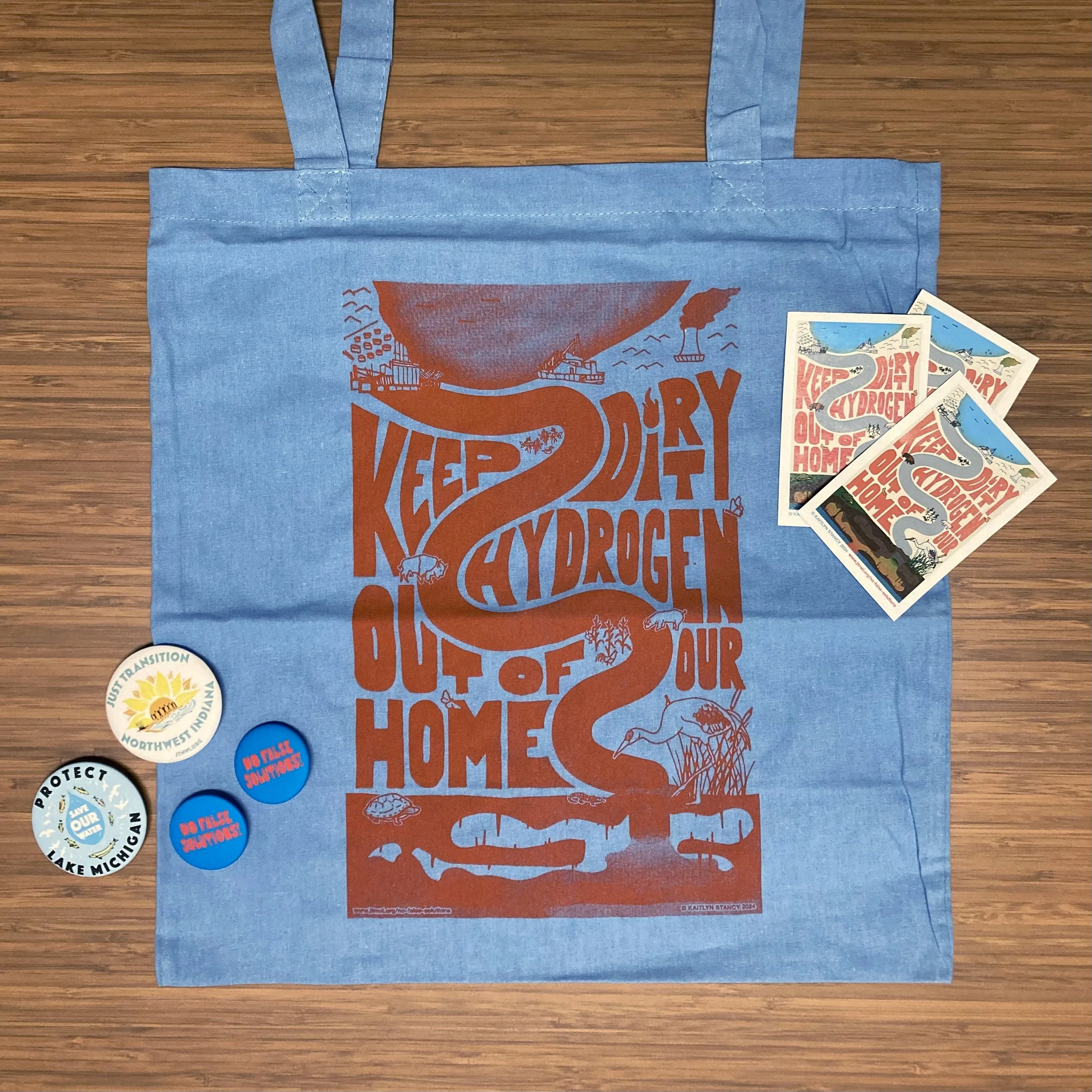 As a partner artist of Just Transition NWI, Kaitlyn was asked to participate in a community art build at Paul Henry’s Art Gallery, and design a poster graphic, tote bags, stickers, and buttons for the “No Dirty Hydrogen In The Midwest” Community Rally in East Chicago, IN on 11/16/24. The event was hosted by JTNWI, Southeast Environmental Task Force, and EarthJustice, with the graphic commissioned by EarthJustice. This event was held to inform and provide resources for community members about the new proposed MachH2 Hydrogen Hub that is being funded for development in our local area.