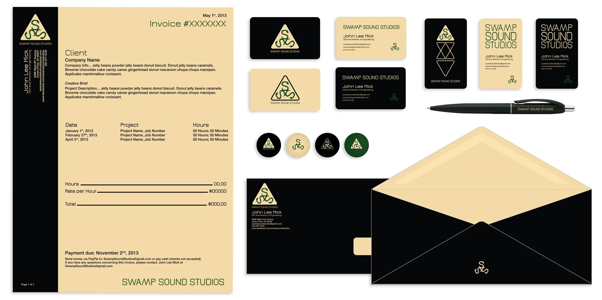 It was requested that this logo contained a triangle with three S's inside of it. We decided that it was only appropriate for the S's in a company named Swamp Sound Studios to become snakes. To complement the swampy feel of the brand, we chose a simple, nature-inspired color palette of green, tan, and black. Marketing collateral include stationery, flyers, buttons, pens, shirts, hats, brand photography, and a website: www.swampsoundstudios.com.